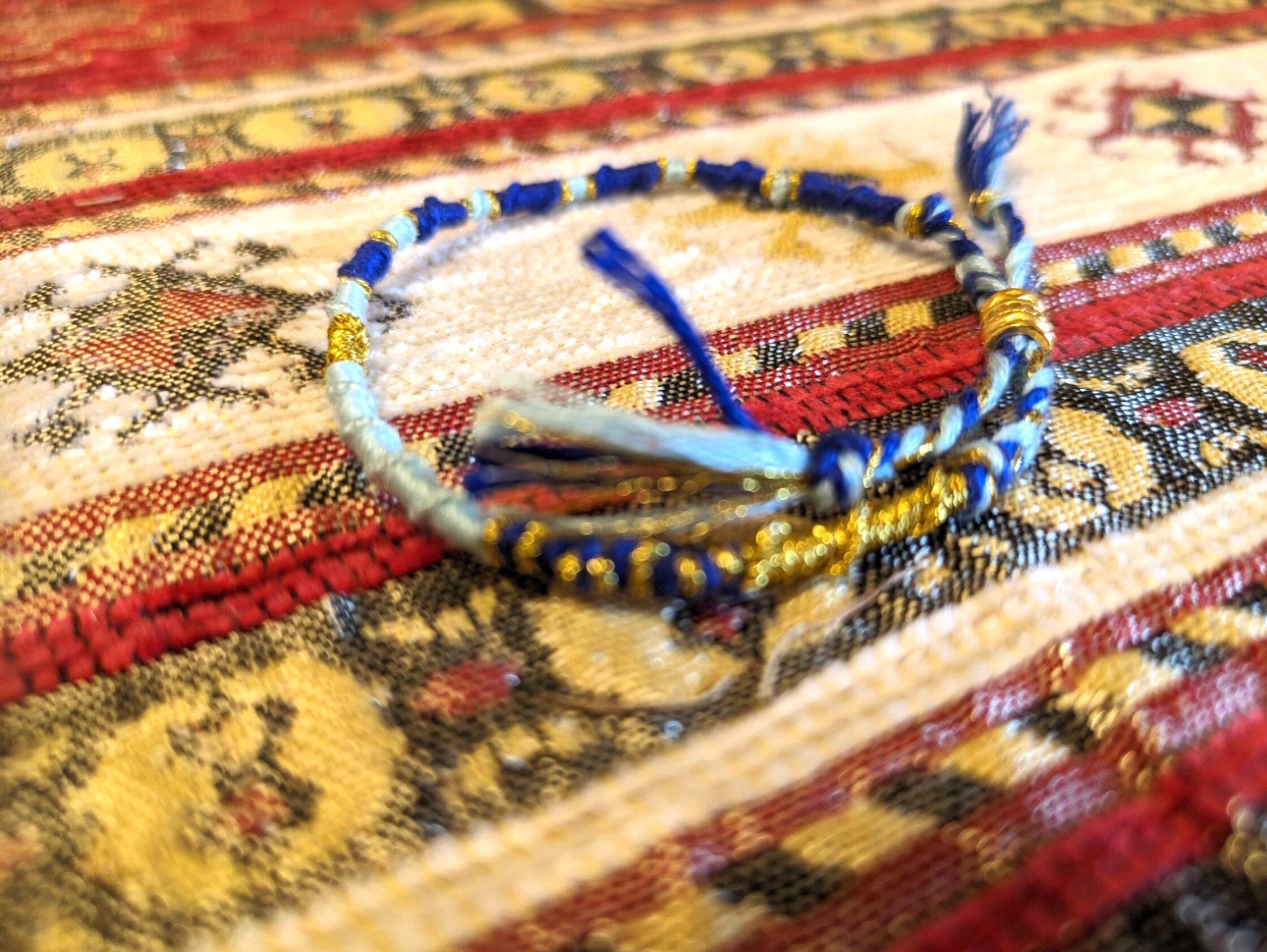 教会の人が願いや想いを込めながら作ったフィタを教会に来た人の手首や足首に付けて幸せを願いました。